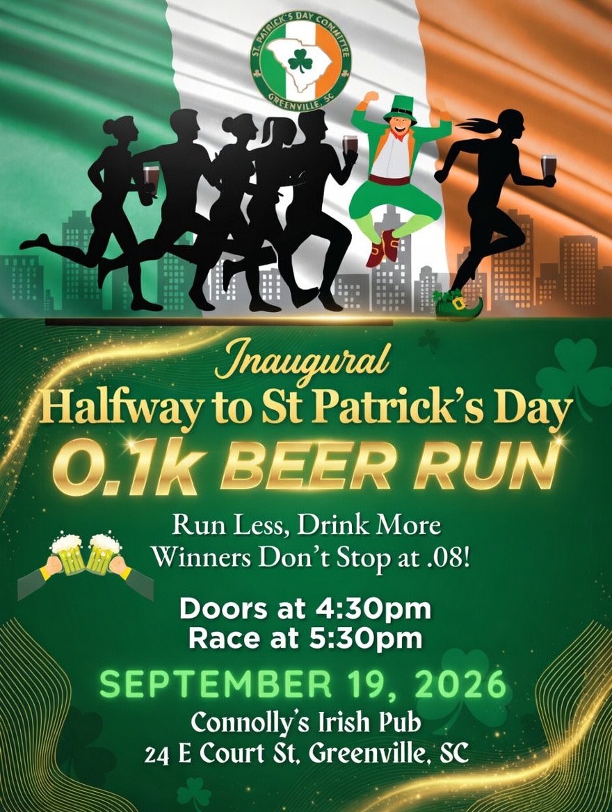 Join the Greenville St Patrick’s Day Committee at Connolly’s Irish Pub for a revival of the beloved Great American 0.1k Beer Run, now with an Irish twist! Wear your most outrageous athletic gear, costume or get all decked out in green for a fun 328ft journey from Connolly’s back door, around the building to the front entrance. Afterwards enjoy a complimentary beer, fun games and live music by Drop O’ The Pure! Register here.